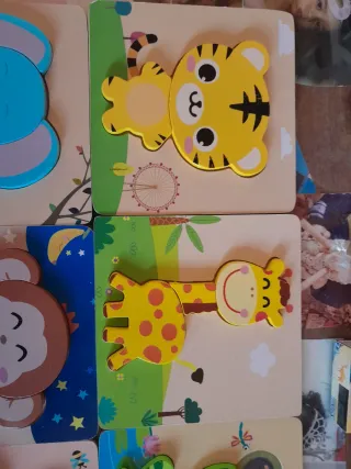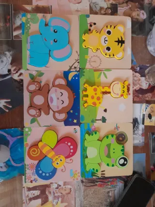 Set de 6 puzzles de madera con divertidos animales. - Incluye elefante, tigre, mono, jirafa, mariposa y rana. - Diseños coloridos y educativos. - Piezas de madera resistentes.