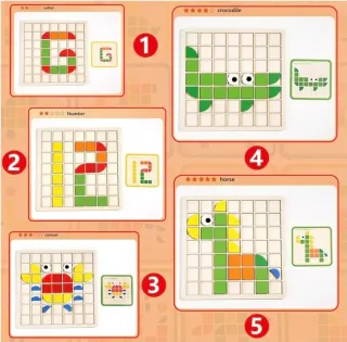 Juego de construcción de mosaicos de madera con 120 piezas. - Incluye tablero y bloques de patrones. - Fomenta la creatividad y la motricidad fina. - Recomendado para mayores de 36 meses.