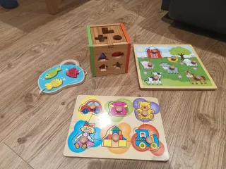 Lote de juguetes educativos tipo Montessori, ideales para el desarrollo infantil. - Incluye un cubo de encaje de formas, le falta alguna pieza. - Puzzle de animales de granja. - Puzzle de vehículos y personajes. - Juguete de clasificación de peces.