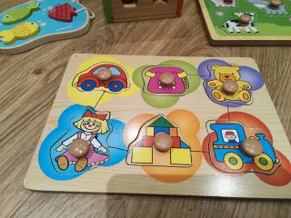 Lote de juguetes de madera y cartón. - Incluye un puzzle de árbol con frutas. - Torre madera de oso - Incluye una puzzle de buho -Encajable de cajas de cartón del 1 al 10. Con diferentes caras -Tortuga arrastable con encajables -Coche de madera de policia - Circuito coches caida libre - La marca es Janod.