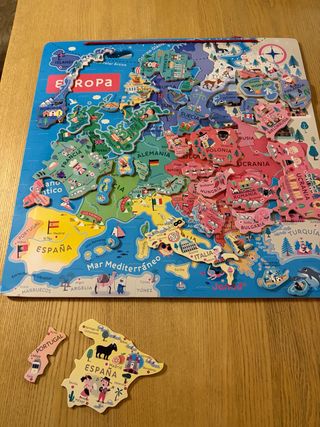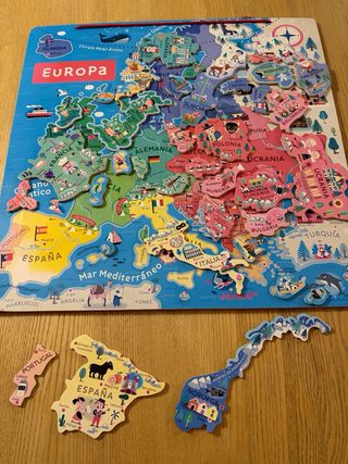 Puzzle educativo de Europa con piezas de madera. - Incluye piezas de países como España, Portugal, Italia y Francia. - Diseño colorido y atractivo para niños. - Ideal para aprender geografía de forma lúdica. Le falta la pieza de Moldavia y Suiza.