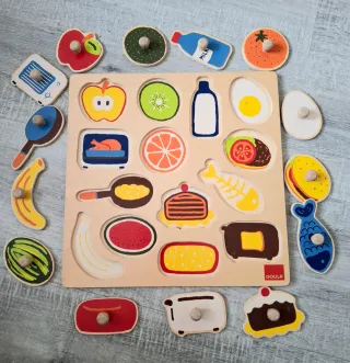 Puzzle de madera de la marca Goula con temática de comida y elementos del hogar. Ideal para los más pequeños. Tanto para familias como escuelas de Infantil. - Piezas de madera con pin. - Diseños de frutas, alimentos y electrodomésticos. Más juegos y juguetes en el perfil.