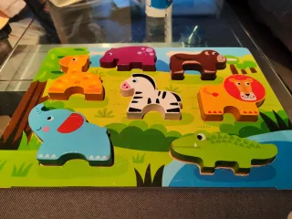 Divertido puzzle de madera con temática de animales. - Piezas de madera resistentes. - Diseño colorido de animales. - Ideal para el desarrollo infantil.