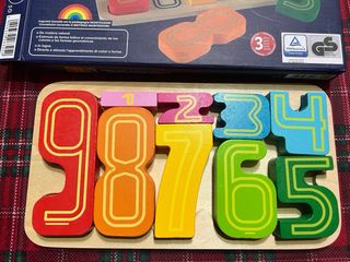Puzzle de madera con números para niños. Cada número está decorado con un dibujo. - Incluye los números del 0 al 9. - Piezas de madera. - Diseños coloridos y educativos.