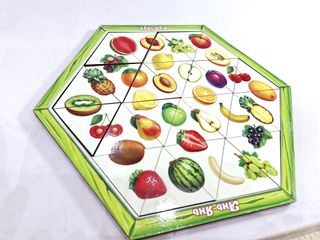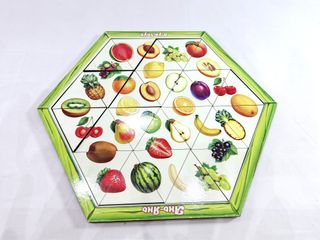 Rompecabezas hexagonal con imágenes de diversas frutas. un rompecabezas lógico de madera con forma hexagonal, diseñado para niños pequeños. Tipo: Rompecabezas educativo de formas geométricas (triángulos). Tema: Frutas y bayas, mostrando tanto el fruto entero como su corte transversal. Desarrollo: Ayuda a mejorar la percepción visual, la motricidad fina y el pensamiento lógico. Edad recomendada: Ideal para niños en edad preescolar. - Diseño educativo con frutas como fresas, piñas, sandías y más. - Piezas de rompecabezas con bordes limpios y cortes precisos.