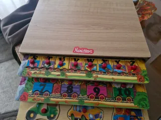 Set de puzzles de madera con temática de trenes. Incluye puzzles de letras y números. - Puzzles de letras con imágenes. - Puzzles de números. - Diseño de trenes. - Marca: Nenittos.