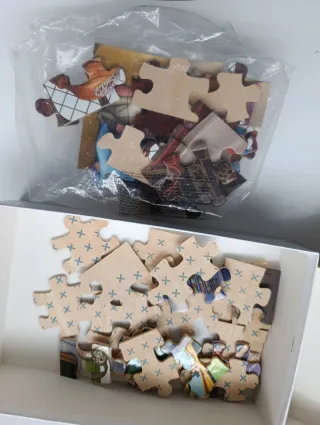 Set de 4 puzzles de madera con divertidos diseños infantiles. - Puzzle de oso con cactus y seta. - Puzzle de excavadora. - Puzzle de barco pirata. - Puzzle de cohete. Le faltan los logos. Pero no afectan al juego. Tiene bolsa de tela para guardarlos. Tres de ellos todavía en el envoltorio. Son de madera