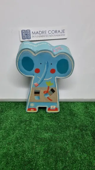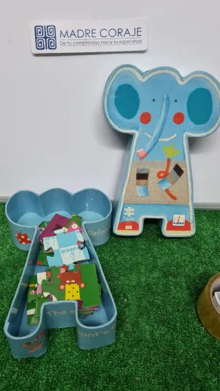 Puzzle de madera con forma de elefante azul. - Diseño colorido y divertido. - Piezas de madera resistentes. - Marca: Djeco.