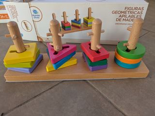 Juego educativo de madera con figuras geométricas apilables. Fomenta el reconocimiento de formas y colores. - Piezas de madera. - Formas: círculo, rectángulo, triángulo, cuadrado y pentágono. - Colores variados y vivos.