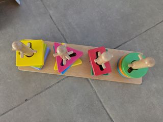 Juego de encajar formas de madera para niños a partir de 2 años. Fomenta el desarrollo de la motricidad fina y el reconocimiento de figuras. - Incluye piezas de colores: círculos, rectángulos, triángulos y cuadrados. - Base de madera con postes para apilar las piezas. 7 eur -2 puzzles de animales 3eur los dos