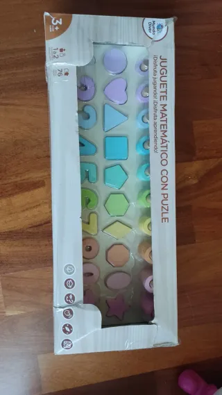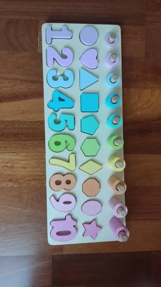 Juguete educativo de madera con números y formas. Incluye los números del 1 al 10. Contiene figuras geométricas como círculo, triángulo, pentágono, cuadrado y estrella. Piezas de colores vivos para el aprendizaje. Con todas las piezas Con signos de uso Hago precio por lotes