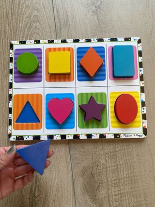 Puzzle de madera de Melissa & Doug con diferentes formas geométricas. - Incluye 8 piezas de formas variadas: círculo, cuadrado, rombo, rectángulo, triángulo, corazón, estrella y óvalo. - Piezas de colores vivos: verde, amarillo, naranja, azul, rosa, morado y rojo. - Base con compartimentos para cada forma.
