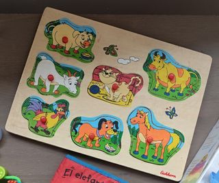Se vende lote de juegos infantiles que incluye varios puzzles y un cocodrilo. - Puzzles de la marca Granja con 6 cubos. - Puzzles de El Jardín de los sueños de Diset con piezas de madera. - Puzzles de Unicef. - Cocodrilo de la marca Hasbro.