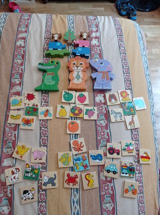 Tres juegos de madera para niños pequeños y bebés. Uno es de asociar por ejemplo vehículos o animales salvajes. Completo. En buen estado aunque algunas de las piezas están algo "pintadas" por detrás por guardarlo en un estuche con pinturas. Otro son tres puzzles de tres piezas de Janod que se unen con imanes (para hacer equilibrio) León, cocodrilo y elegante. En buen estado. El tercero sin algunos animales de la selva para jugar a hacer torres. En buen estado.