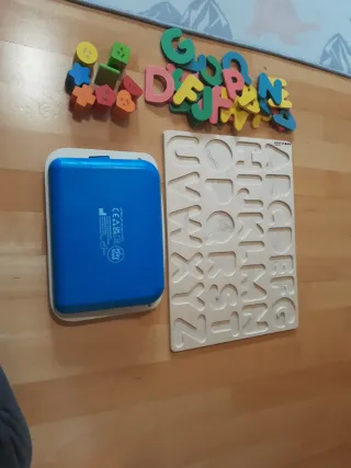Set de juguetes educativos de madera. - Puzzle de abecedario con letras de colores. - Bloques de formas geométricas para encajar. El puzle de letras está pintado con lapices de colores por lo demás se conservan bien.
