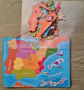 Puzzle de madera imantado con las Comunidades Autónomas y provincias de España. Le falta la pieza de la provincia de Gerona y la pieza de Málaga está sin el nombre (ver la foto). - Incluye Portugal, Francia y Marruecos. - Piezas con nombres de las provincias. - Ilustraciones de monumentos y elementos característicos. - Ideal para aprender geografía de forma lúdica.