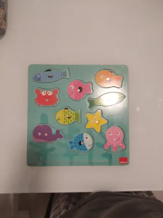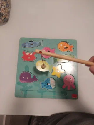 Divertido puzzle de madera con temática marina de la marca Goula. Ideal para los más pequeños. - Incluye 10 piezas de animales marinos. - Diseño colorido y atractivo. - Fabricado en madera resistente. -Caña magnética para pescarlos.