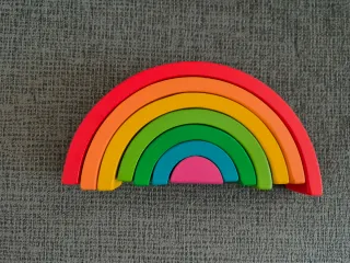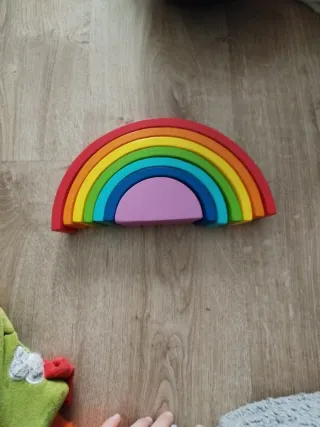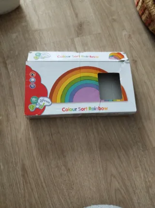 Juego de clasificación de colores en forma de arcoíris, hecho de madera. - Piezas de madera para clasificar por color. - Diseño de arcoíris. - Estimula la motricidad fina y el reconocimiento de colores.