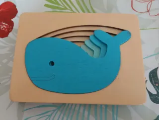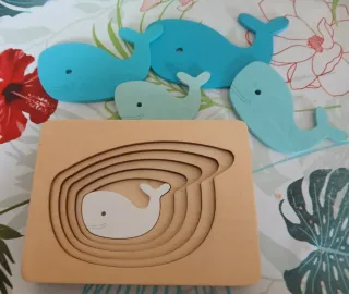 Puzzle de madera Montessori, con forma de ballena azul. - Pieza principal de madera azul. - Base de madera clara. - Diseño de capas en la cola.