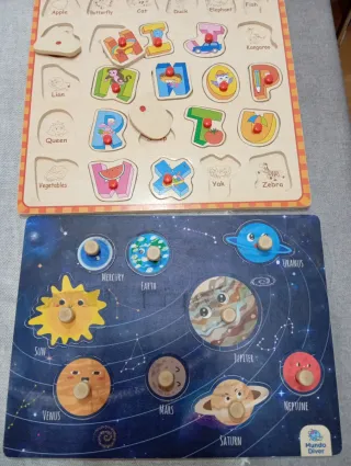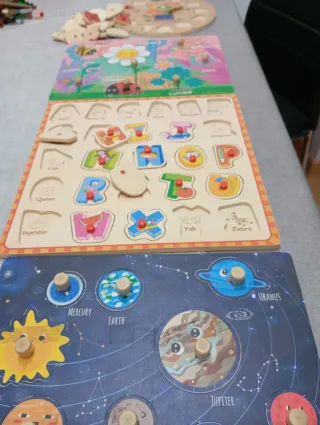 Set de cuatro puzzles de madera para niños. - Puzzle de abecedario con letras. - Puzzle de planetas del sistema solar. - Puzzle de flores y animales. - Puzzle de números. De reloj. Todos completos y en perfecto estado.