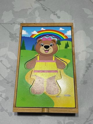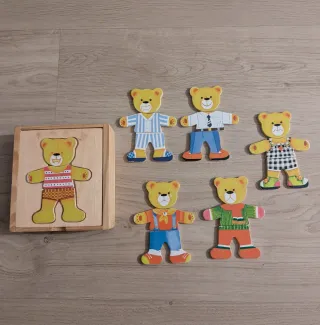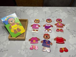 Divertido puzzle de madera con simpáticos ositos. - Incluye 7 piezas de caras y conjuntos de ropa. Perfecto estado!