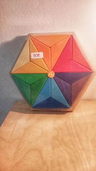 Puzzle de madera con forma hexagonal y colores complementarios de la marca Grimms. Las piezas están diseñadas para encajar y formar un círculo de colores vibrantes. - Piezas de madera. - Diseño hexagonal. - Colores del arcoíris.