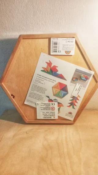 Puzzle de madera con piezas de colores formando un hexágono. - Piezas de madera. - Diseño hexagonal. - Incluye guía de modelos.