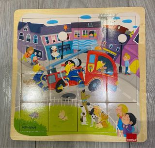 Divertido puzzle de madera con temática de casas y vehículos. Ideal para los más pequeños. - Piezas de madera con diseños coloridos. - Incluye diferentes edificios y un coche de policía. - Base de madera con el logo de Goki.