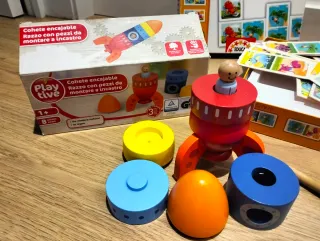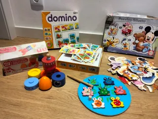 Lote 4 juegos madera cohete, dominó, puzzle, pesca