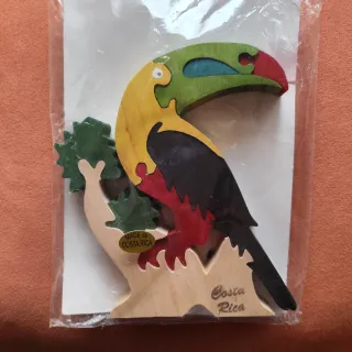 Bonito puzzle de madera con forma de tucán, ideal para coleccionistas o como decoración. Nuevo sin uso en su funda original - Hecho en Costa Rica. - Diseño colorido de tucán. - Pieza de madera.