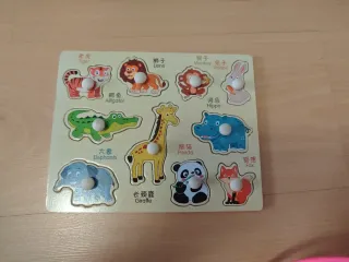 Juego de mesa educativo con piezas de madera. - Incluye 10 animales: tigre, león, cocodrilo, elefante, jirafa, mono, conejo, hipopótamo, panda y zorro. - Cada pieza tiene el nombre del animal en inglés y chino. - Ideal para el aprendizaje temprano.