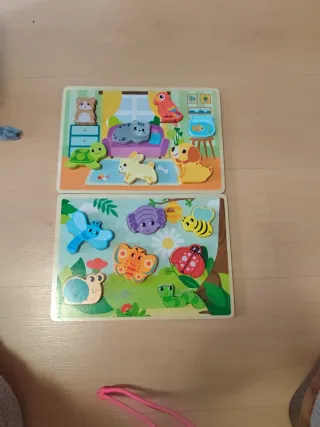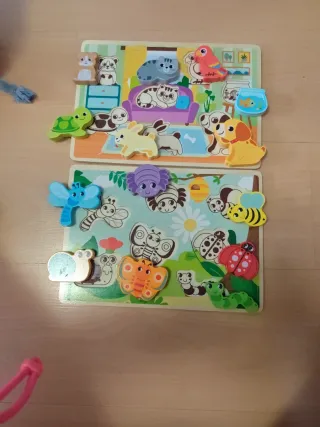 Dos tableros de puzzles de madera con divertidos animales. - Un tablero con animales domésticos en una casa. - Otro tablero con insectos y animales del jardín. - Piezas de madera de colores vivos.
