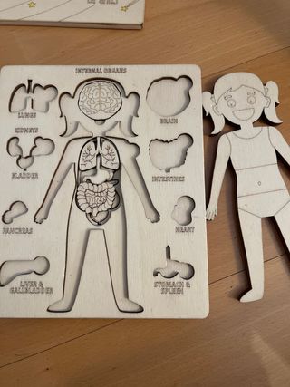 Puzzle educativo de madera para aprender sobre el cuerpo humano y sus órganos. - Incluye piezas para el cerebro, pulmones, riñones, vejiga, páncreas, hígado y vesícula biliar, intestinos, corazón, estómago y bazo. - Figura de niña de madera para ensamblar. - Ideal para el aprendizaje interactivo. Hay uno roto los riñones,