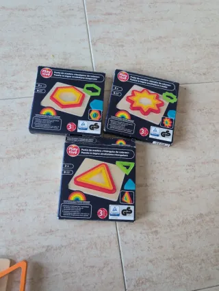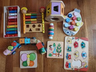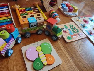 Conjunto de varios juegos de madera para niños. - Tren de bloques de construcción con vagones. - Puzzles de encaje con figuras de animales. - Xilófono de colores con baquetas. - Ábaco de cuentas. - Juguete de encajar formas.