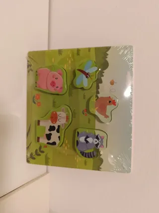 Puzzle de madera con temática de animales de granja, ideal para los más pequeños. Las piezas son grandes y fáciles de manipular. - Incluye 5 piezas de animales: cerdo, vaca, gallina, mapache y libélula. - Base con siluetas para encajar las piezas. - Empaquetado original sin abrir.