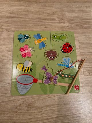 Divertido puzzle de madera con temática de animales e imanes. Ideal para los más pequeños. - Incluye piezas de insectos y animales. - Base de madera con siluetas. - Incluye red y caña de pescar con imán.