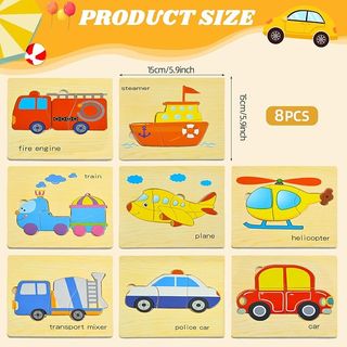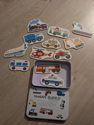 Set de puzzles de madera con diferentes vehículos. - Incluye tren, camión, avión, taxi, helicóptero, moto, excavadora, barco, autobús, ambulancia, coche de policía y camión de bomberos. - Diseños coloridos y divertidos. - Ideal para el desarrollo de la motricidad fina y el reconocimiento de formas.