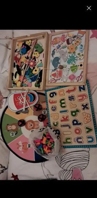 Set de juguetes educativos montessori de madera: pizarra para dibujar y pegar piezas imanes de madera o plástico, tambien para pescar piezas del mar), con dos caras la pizarra. puzzle con letras alfabeto. letras y números con imanes. Juego para aprender a atarse cordones. Diana de tela con bolas que se adhieren #Montessori #educativo