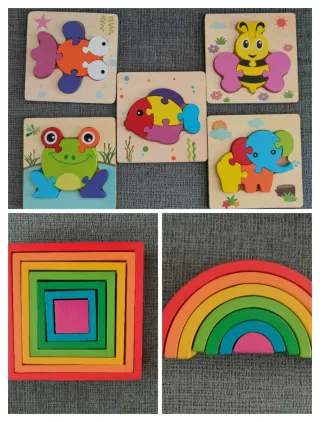 Lote de juguetes de madera para niños, ideales para el desarrollo de habilidades. - 5 puzzles de animales. - Arcoiris de madera. - Cuadrado arcoiris de madera. Cada juguete 6€, todo 15€.