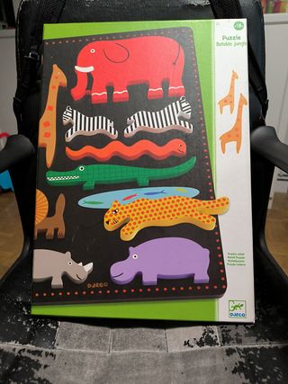 Juego de puzzle de madera Djeco con divertidos animales para los más pequeños. Las piezas son grandes y fáciles de manipular ideal para juegos en el coche - Marco de madera. - Ilustraciones coloridas de animales. - Piezas de puzzle de madera giratorias Tal como se muestra en las imagenes. Signos de uso , pero buen estado