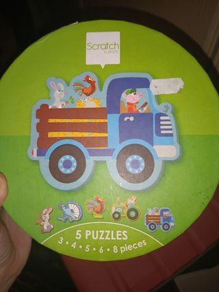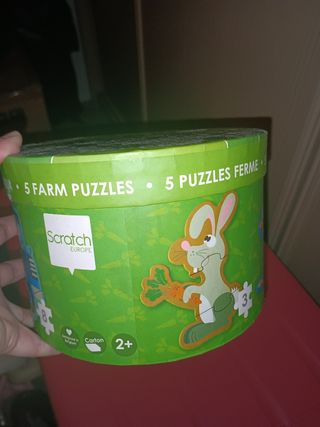 Juego de 5 puzzles de granja de la marca Scratch Europe, ideales para niñ@s de 2 años en adelante. Los puzzles son de madera y vienen en una caja redonda. - 5 puzzles con diferentes diseños de animales de granja. - Piezas de entre 3 y 8 piezas por puzzle. - Perfecto estado.