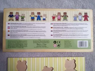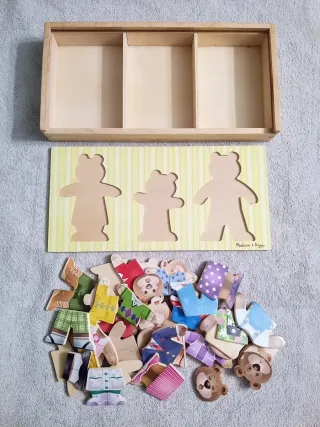 Juego de vestir a los ositos de madera. - Incluye 3 figuras de ositos. - Incluye múltiples prendas de vestir y accesorios. - Caja organizadora de madera con compartimentos. - Aunque su estado general es bueno presenta algunos desperfectos (última foto).