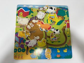 Divertido puzzle de madera con temática de granja y animales. - Incluye un granjero, vaca, cerdo, caballo, oveja, gallina, perro, conejo y patitos. - Ilustraciones coloridas y alegres. - Piezas de madera resistentes.