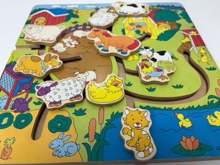 Divertido puzzle de madera con temática de animales de granja y diseño de laberinto. - Incluye piezas de animales de granja - Base de madera con caminos para guiar las piezas. - Ideal para el desarrollo de la motricidad fina y la resolución de problemas. - Piezas grandes NO desencajables