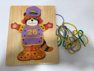 Divertido puzzle de costura con forma de mapache. - Diseño de mapache con agujeros para pasar el cordón. - Base de madera con ilustración. - Ideal para desarrollar la motricidad fina.