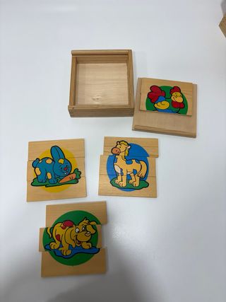 Se venden cuatro coloridos puzzles de madera para niños. Son ideales para desarrollar habilidades. - Tres puzzles con formas de animales y vehículos. - El puzzle se puede hacer con letras del abecedario o por números, una cosa por cada cara. - Piezas de madera resistentes y duraderas. - Colores alegres y atractivos para los más pequeños. Sueltos serían a 4€ unidad