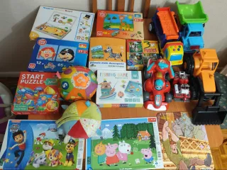 Lote variado de juguetes para niños de 0 a 5 años. Incluye juegos de mesa, puzzles y vehículos. - Pizarra magnética. - Puzzle de animales. - 2 Juegos magnéticos de caras y animales. - Juego de pesca. - Camiónes de juguete. - Coche de juguete. - Formula 1 teledirigido. - 2 Pelotas de actividades. - Puzzles de Paw Patrol y Peppa Pig. - Caja de herramientas de madera.