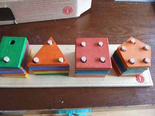 Juego de encaje de formas geométricas de madera. - Incluye 25 piezas de madera. - Diseños de formas geométricas. - Base de madera para encajar las piezas.