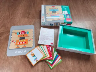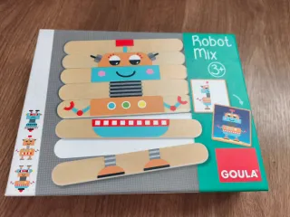 Interesante juego-puzzle de construcción de robots marca Goula. - Piezas de madera para crear diferentes robots. - Incluye tarjetas de reto con tres niveles de dificultad. - En perfecto estado (salvo pequeños desperfectos en la parte posterior de la caja y que se puede ver en las fotos)