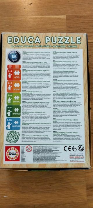 Pack de 4 puzzles para niños de 18 meses o menos. Nuevo, casi sin uso. Incluye una caja de madera para guardarlo ordenadamente.